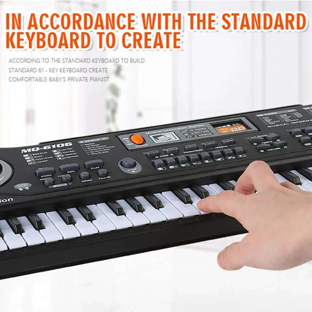 The 61 Keys Electronic Keyboard with Microphone is a fun and educational toy designed to develop your child's musical abilities. With 16 tones, 8 percussion sounds, 10 rhythms, and 6 demo songs, this keyboard offers a variety of features to keep your child entertained for hours. The included microphone allows for interactive play, enabling kids to sing along while playing music. Perfect for young musicians!